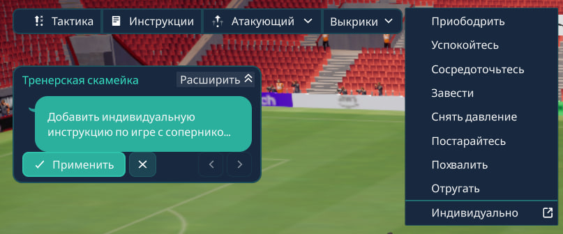 Особое применение выкриков работает для игроков у которых слабые психологические характеристики или этот игрок достаточно молод для большого футбола, это особенно проявляется, когда вы выпускаете молодого амбициозного игрока, но его характеристики слабые за счёт его возраста. В таком случае , имеет место быть применять выкрики отдельному игроку , это повлияет на его результаты матча , и соответственно рост его характеристик будет более продуктивным.