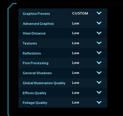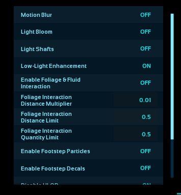 All of those foliage settings? Definitely want those as low or off as possible. That's processing power being used when we need it the most (aka RUN FOR YOUR DAMN LIFE WITHOUT HITCHING).