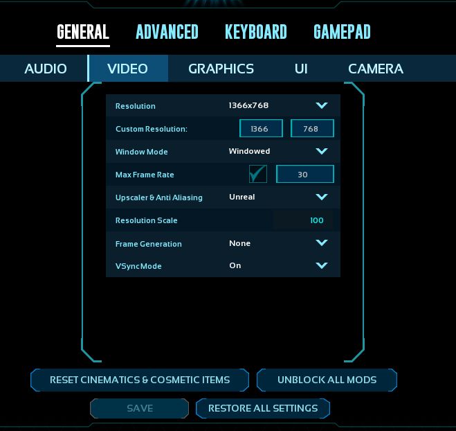 With what we know about our GPU, we can discern it runs games best at a modest resolution of 1366x768. Anything lower, we get too much pixelation. Any higher, and the card begins to heavily struggle under the render load. Since it's Unreal5, 60fps should not be your target framerate, so we'll go ahead and set this to 30.