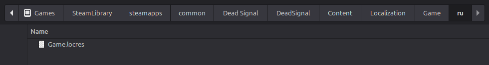[Папка с игрой]/DeadSignal/Content/Localization/Game/ruЕсли какие-то папки отсутствуют, создайте их вручную. - Поместите файл Game.locres в папку ru.