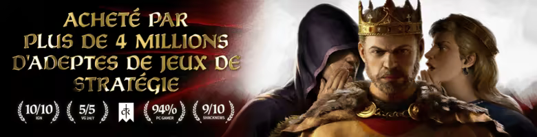 Votre héritage vous attend. Choisissez une maison noble et guidez votre dynastie vers la grandeur sur des générations, dans un Moyen Âge épique. La guerre n'est qu'un des moyens d'établir votre règne. La vraie stratégie requiert des talents diplomatiques affutés, la maîtrise de votre royaume et de la ruse. Crusader Kings III prolonge la série populaire de Paradox Development Studio, avec son mariage acclamé de grande stratégie immersive et de jeu de rôle médiéval profond.