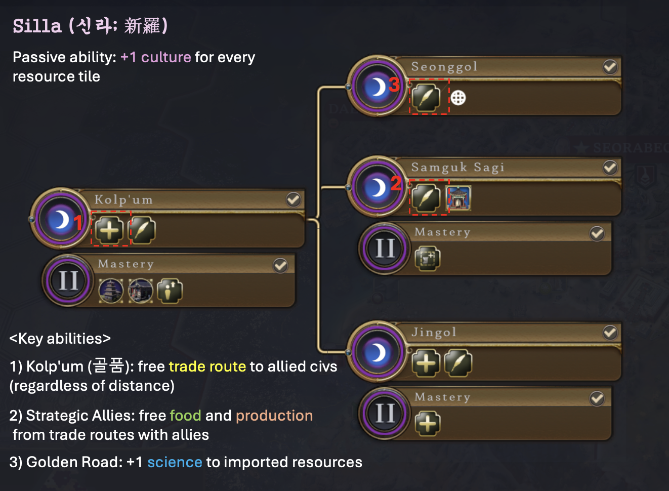 Kolp'um (골품)- When forming an Alliance, each leader receives a free Trade Route from the other leader's Capital. You gain the resources, as well as +2 gold per the number of resources. These Trade Routes do not go away when the Alliance ends.