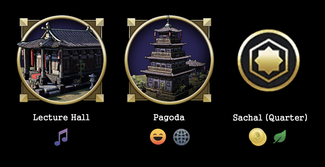 Sachal (사찰)- Unique Quarter; +1 Gold for every Resource you have slotted in this City.