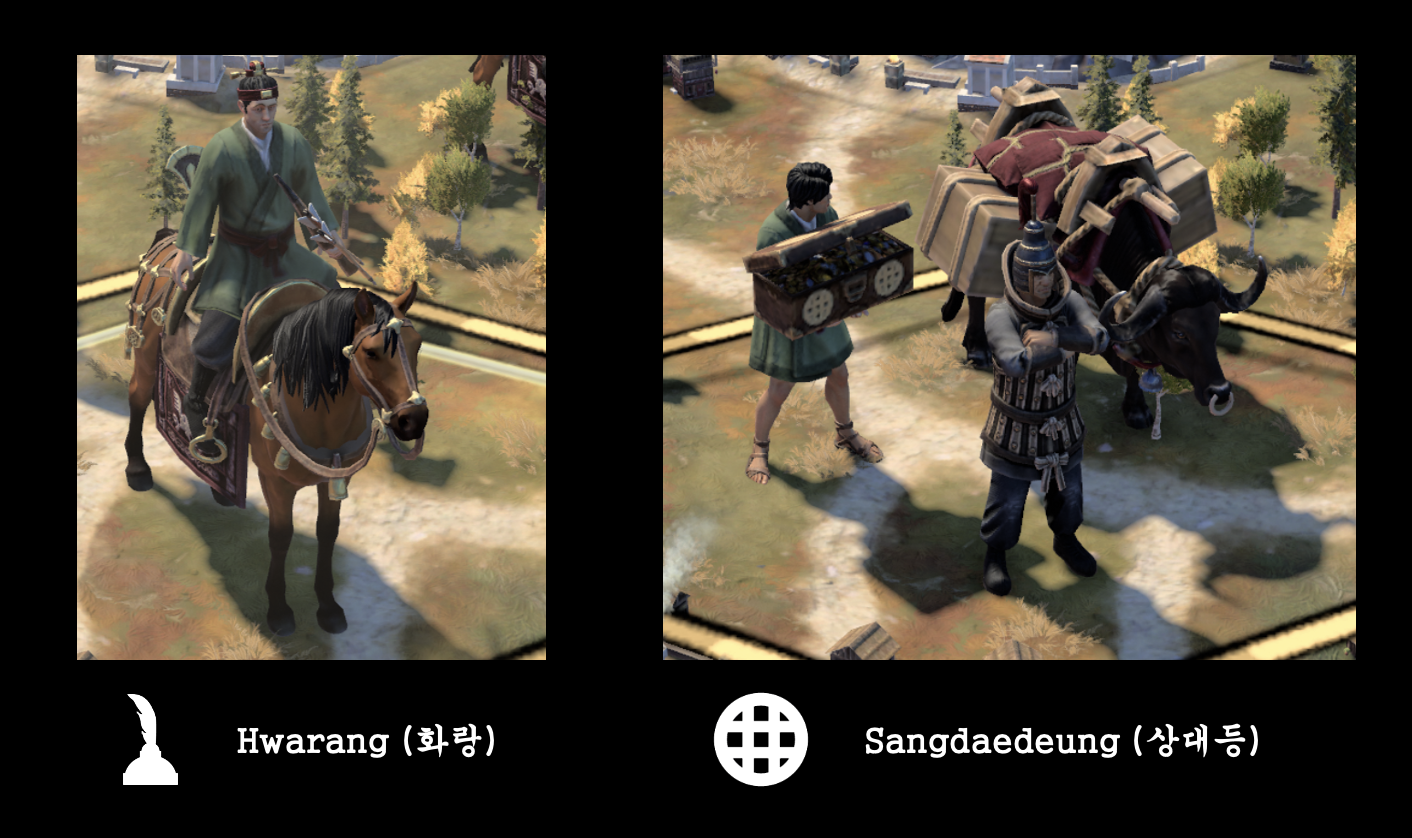 Sangdaedeung (상대등)- Unique merchant unit. Earn +5 gold times the relationship level (max 500) when creating a trade route.
