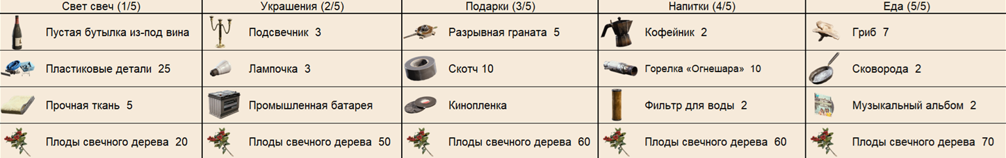В рамках ивента «Заморозки» в игре запускается временный проект по сбору праздничного стола. Он состоит из пяти этапов: