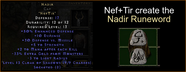 In order to create a Runeword, you must decide on an item you'd like to enhance. It can be armor, helmet, weapon or a shield. The process of creating a is easy: just drag and drop runes into the desired item's sockets (= all items which can have sockets). You don't need a horadric cube for that, you can do it in your inventory. Here is an example with the above mentioned Nadir ("NefTir") Runeword: