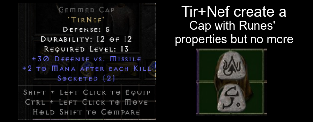 Have a look yourself, here I just inserted 2 Runes: Tir and Nef inside a Cap with 2 sockets. The cap just gained properties of those 2 runes ↴