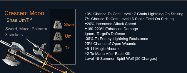 200% Enhanced Damage, +75% Damage To Undead, Requirements -20%, 20% Increased Attack Speed, +50 To Attack Rating Against Undead, +2 To All Skills, All Resistances +75, 20% Faster Hit Recovery, 11% Mana Stolen Per Hit, Hit Causes Monster To Flee 25%, Hit Blinds Target +33, +2 To Mana After Each Kill, 30% Better Chance Of Getting Magic Items