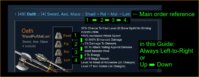 4. Not only correct item type and correct runes matter, but also the order. While using this guide, refer to title or the image to follow the order. Insert Runes one after another, as indicated. The title and the image double each other, with time you will memorize the Runes' names and won't need a visual reference.