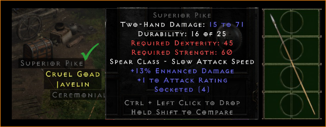 3. The item type must be eligible for a runeword. Mind not only the item type such as helmet / weapon but also the class of the latter. When you create a rune word for a weapon, make sure to double-check what weapon class that is: is it a sword or a mace? A Spear or a Polearm? <-- these two look very similar, so pay close attention to the text description!To check the class of the item hover on it, and look at the XXXXX Class parameter: