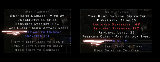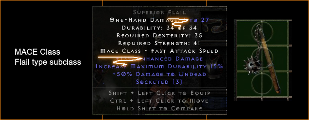 Mace class is another trap. This of "Mace" class as of superclass both Maces (recursive, yes) AND Hammers AND Flails. When making a runeword for a mace class item, refer exactly to the word I used: for example, Heart of the Oak will only work with Flails (I made an explicit note on that one), it WON'T work with hammers, eventhough they belong to Mace superclass. The Hammer subclass items are not eligible to be bases for that runeword. Lawbringer Runeword accepts Hammers, though. Pay very close attention for the Class and Subclass mentioned.