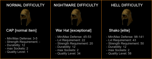 When you unlock Nightmare and Hell difficulty you will notice new names for the items dropped but visually those items will be identical to those from the previous difficulty. The difference will be the adjusted stats of the items and their required level. See yourself, here is an example of how the weakest helmet would look of different difficulties: