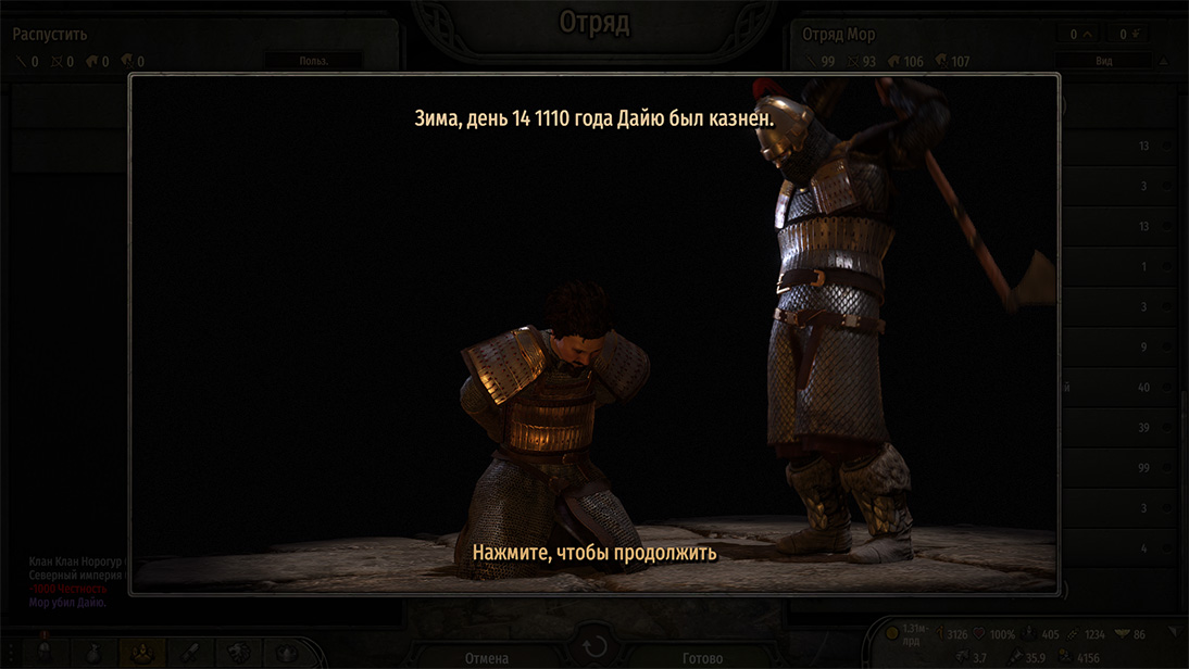 За первый вечер игры, мне удалось выщимить и казнить по одиночке много лордов. Пару раз везло когда армия Вландии нападала на какой то из городов, вот тогда я в обороне до 3-5 штук голов за раз собирал. Уже не обращал внимания на сообщения о порче отношений =) Стали чаще появляться отряды во главе с женщинами, а войска вландийцев по большей части состояли из лоу-тир юнитов. И вот первый клан был уничтожен: с казнью очередного лорда/леди, выскочило сообщение об уничтожении клана и смертей сразу 6 персонажей, это оказались несовершеннолетние дети клана. Видимо сиротских домов в Кальрадии нет =(