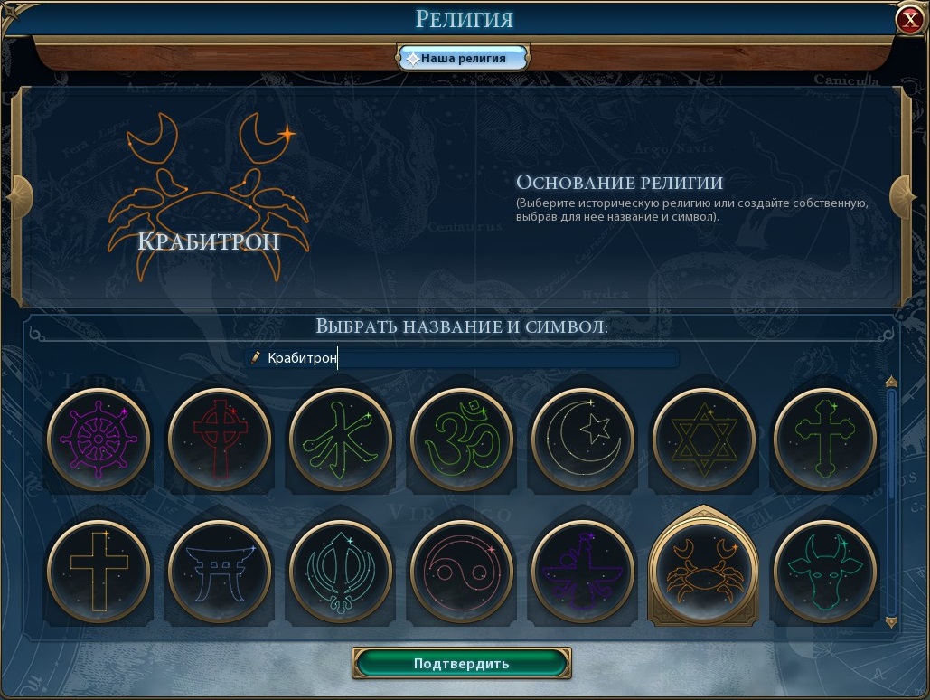 В определённый момент игры я создал религию. Конечно же, это культ Великого Крабитрона, который учит любви и самопожертвованию (любить меня и жертвовать мне свои деньги)