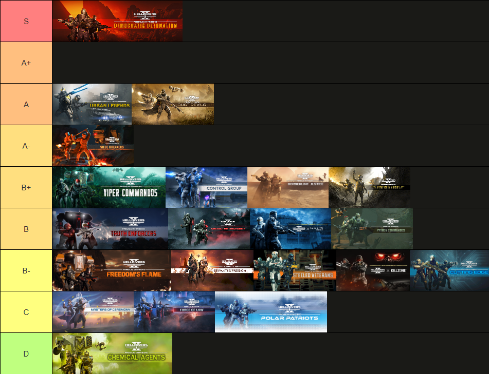 Чистый "A-" ( был бы "A" тир, если бы не уравнитель ), так как мы получаем отличный гранатомет ( против жуков / иллюминатов ), гранату-щит для игры на автоматонах и штурмовой молот, который хоть и фановый, но очень убойный ( позволяет шотать чарджеров, халков и иногда жнецов ). Также мы получаем с первой страницы лазерный дробовик, который на близкой дистанции рвет любого малого и среднего жука за счет урона и скорострельности. В варбонде есть универсальные вещи ( граната на автоматонов, молот для всех, гранатомет для жуков ), что позволяет поставить его в технический "A" тир с припиской "A-". Из минусов - броня. Легкого комплекта в варбонде нет, в магазине также купить нельзя. Также из минусов - уравнитель. Бахает очень больно и красиво, но перезарядка в 120 секунд и не ваншоты статиков на карте ( ХОТЯ С ТАКОЙ БАНДУРОЙ ВАНШОТ ДОЛЖЕН БЫТЬ ) делают его в большей степени бесполезным, так как есть более сильные альтернативы для определенных действий. В целом его можно взять как большую бомбу, в минусах он условно находится. Советую брать варбонд на уровне "A" тира или сразу после покупки всего "A" тира.