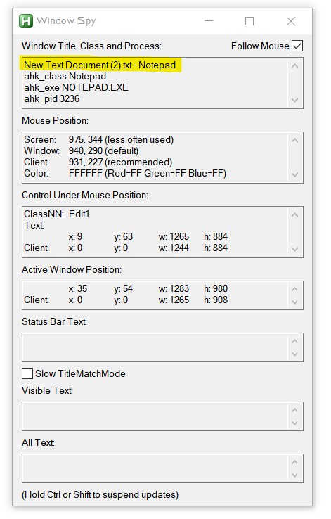 7) Return to Window Spy and check the box "Follow Mouse" (This will update the window information as you move your mouse)