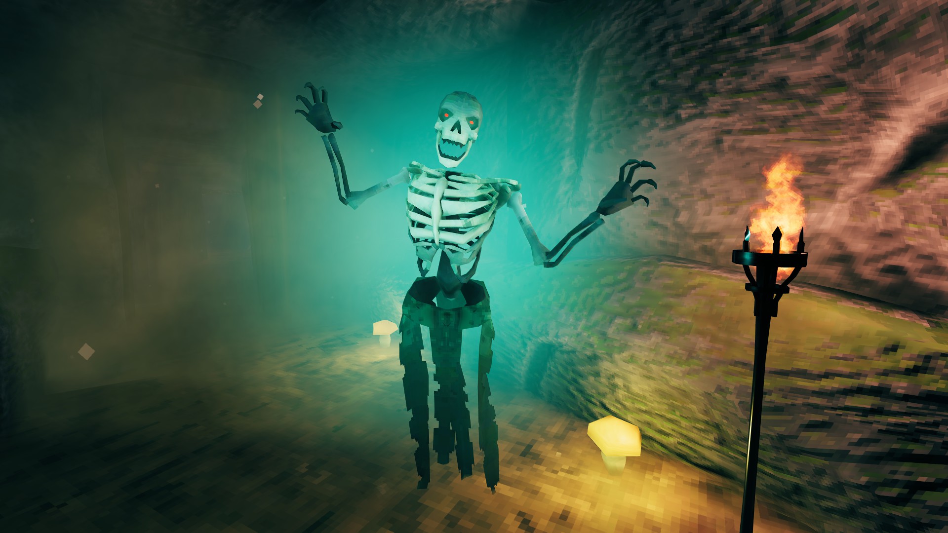 Первый — это тот же скелет, только с железной светящейся дубиной в руках, да и убивать его нужно чуть дольше, чем обычного скелета. Если он попадает по игроку, то персонаж получает физический урон и отравление. Убив такого, получаем обломки костей и свой первый красивый светящийся трофей.